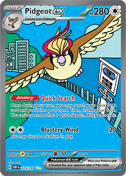 The narrative takes a leap with Pidgeotto, portrayed against a canvas of refreshing green, symbolizing the next phase of growth and challenges. It’s a reflection of maturity, a readiness to face the world with renewed vigor. Pidgeot ex, with its dynamic pose and mesmerizing backdrop, feels like the climax of an epic tale—a bird, now fully realized, soaring towards its destiny. The intricacies of this evolutionary series invite viewers to pause and reflect, appreciating the nuanced storytelling that each card offers.