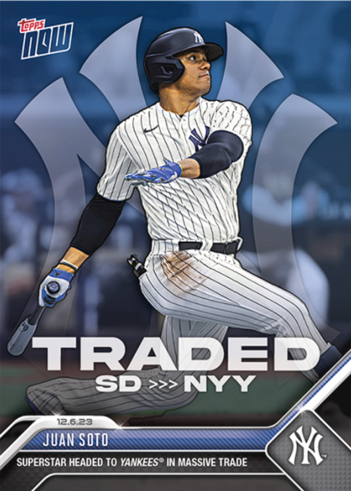 Just one day after his high-profile trade, Juan Soto's first baseball card as a New York Yankee has been released. The card, featuring Soto in the Yankees' iconic pinstripes, is an online-exclusive being offered by Topps through their on-demand platform.