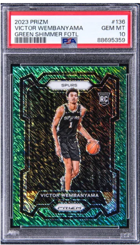 Not to be outdone, Victor Wembanyama, the towering basketball prospect, saw a surge in interest surrounding his memorabilia, particularly his rookie cards. A highly sought-after 2023-24 Panini Prizm Green Shimmer First Off The Line rookie card, numbered 1 of 5 and graded PSA 10, stunned the audience by fetching $113,460. Another rarity, a Gold Shimmer rookie card numbered 7/10, was not far behind, closing at an impressive $49,410.